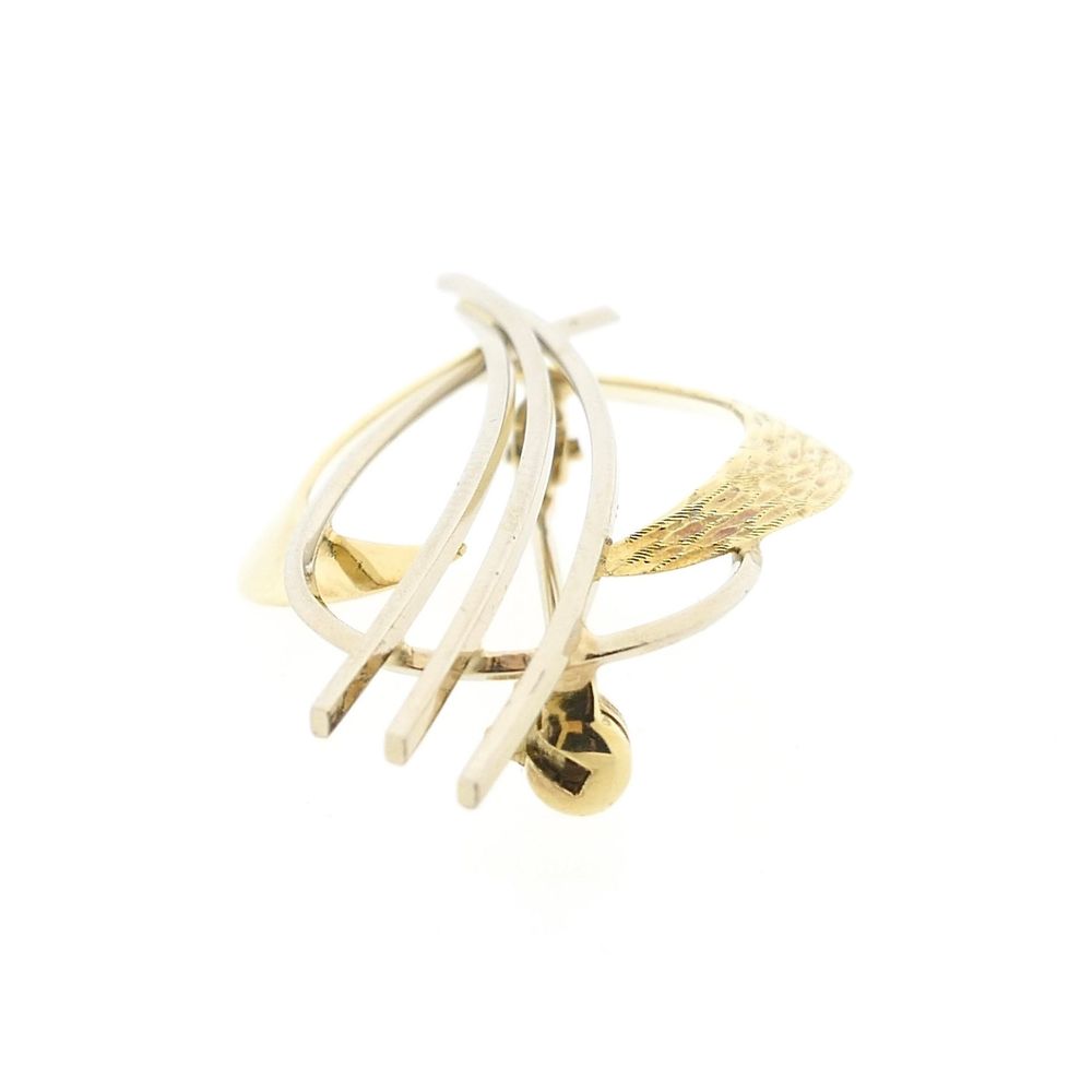 Vintage two-tone gold fantasy brooch. The yellow gold is crafted with a bark-like texture, interspersed with four smooth white gold lines. A beautiful piece of jewelry with a luxurious appearance. The brooch is crafted from 14-karat white and yellow gold (585/1000).