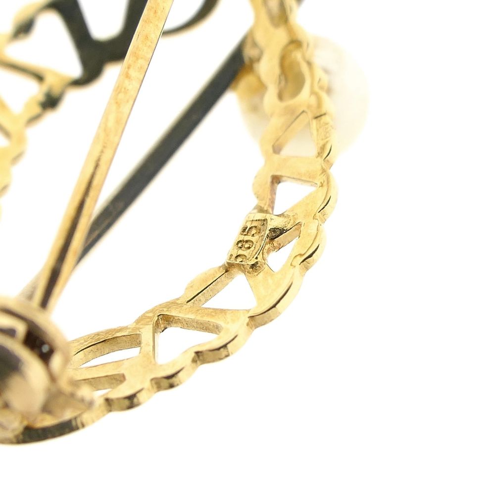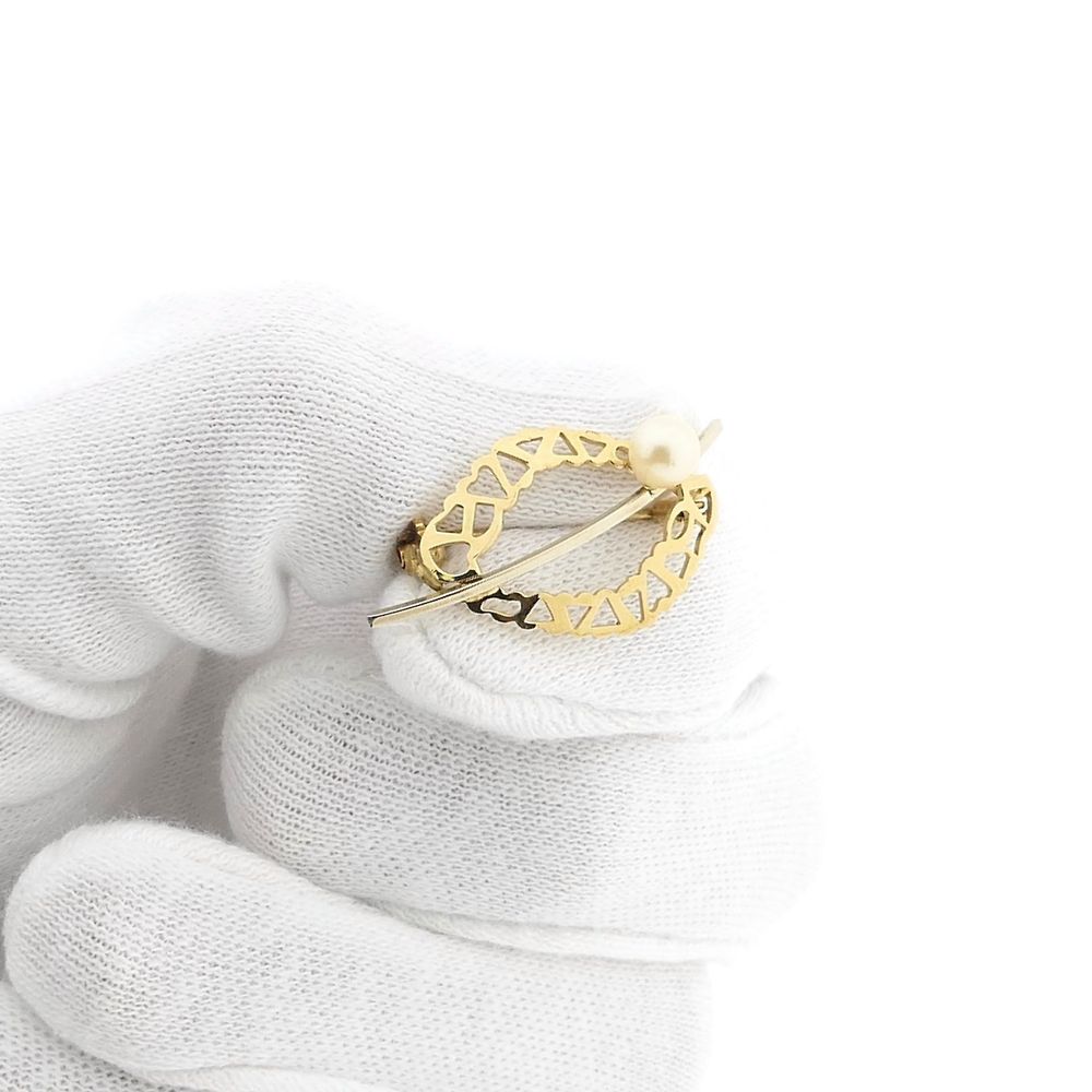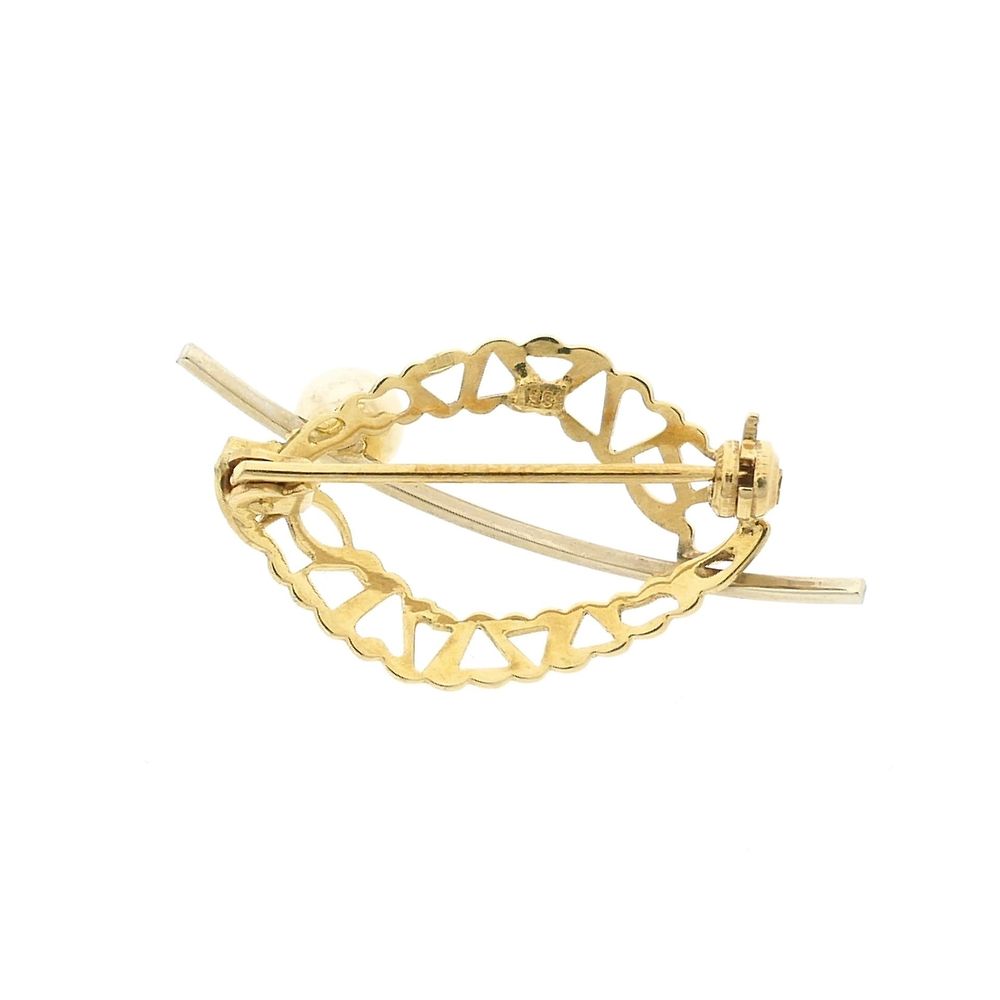Two-tone gold brooch with a fantasy design. A white gold line is set in the center, topped by a cultured pearl. The pearl has a diameter of 5.4 mm. The brooch is crafted from 14-karat white and yellow gold (585/1000).
