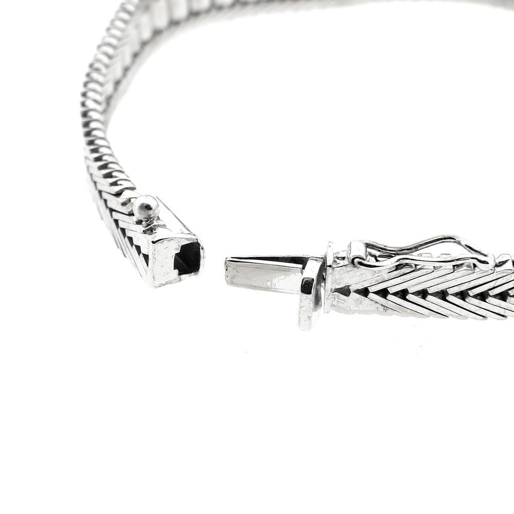 The width tapers from 5.4 to 11.1 mm, with the matte details providing this piece with extra depth. Thanks to the box clasp with a safety hook, it feels well-crafted and secure when worn.