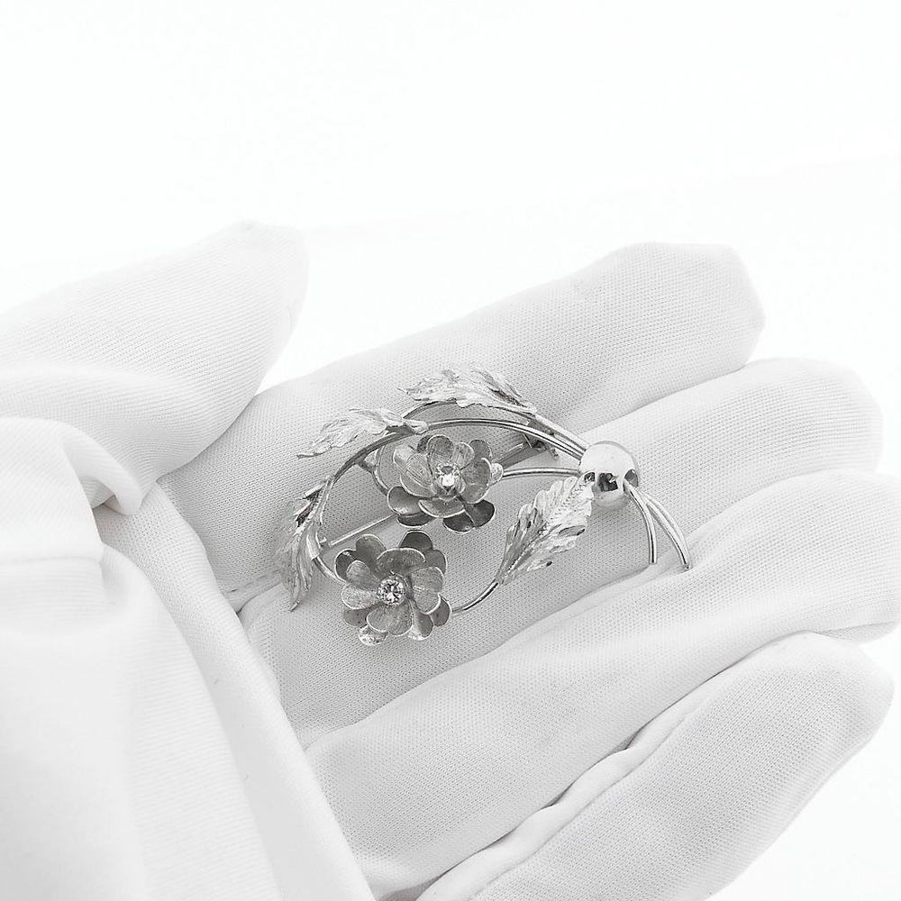 White gold floral brooch set with stunning natural diamonds. Crafted from 18-karat white gold (750/1000), this brooch is a gemstone of the highest quality.
