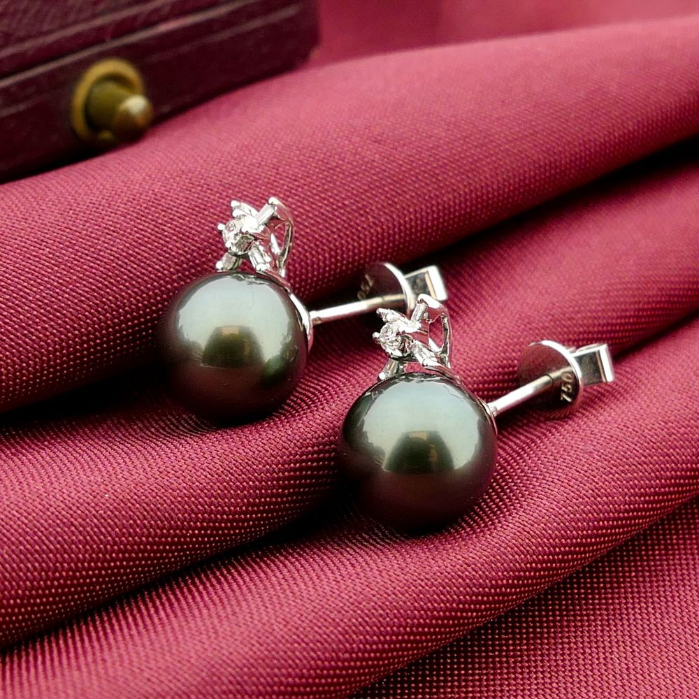White gold earrings set with Tahitian pearls and a total of 0.04 ct. diamonds. A beautiful pair of stud earrings crafted from 18-karat white gold (750/1000).