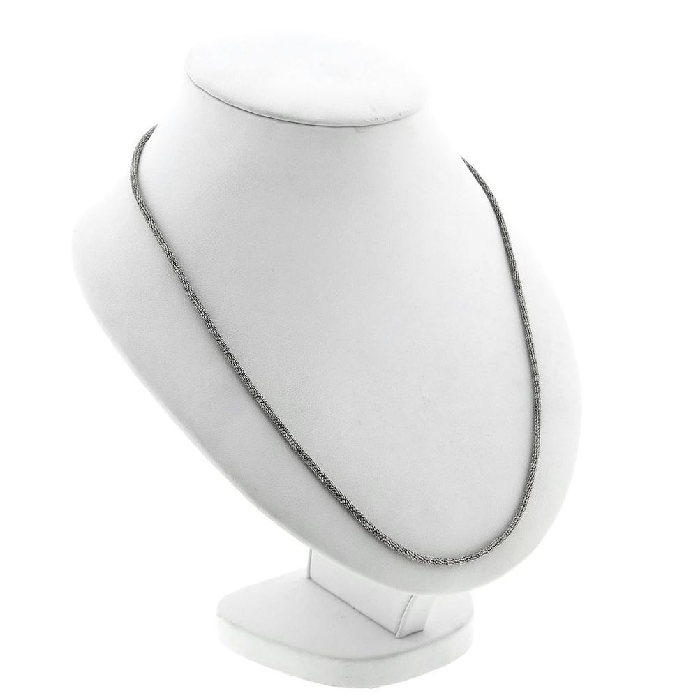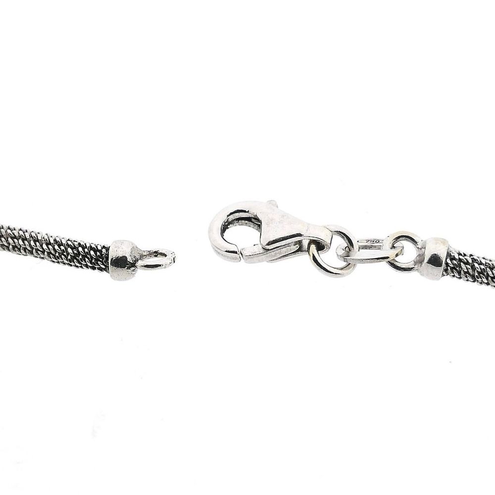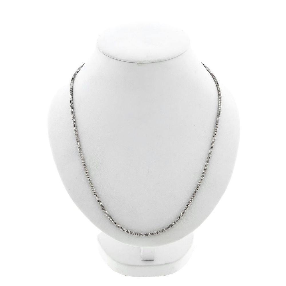 White gold fantasy link necklace. The solid links are made up of small gourmet links that go all the way around. They are so small that they resemble tiny mirrors, causing the necklace to sparkle when light hits it. The necklace is suitable for solo wear or to be worn with a pendant. Please ensure that the loop of the pendant has a minimum diameter of Ø 5 mm. A beautiful and luxurious piece of jewelry to wear around the neck. The necklace closes with a lobster clasp and is made of 18 carat white gold (750/1000).