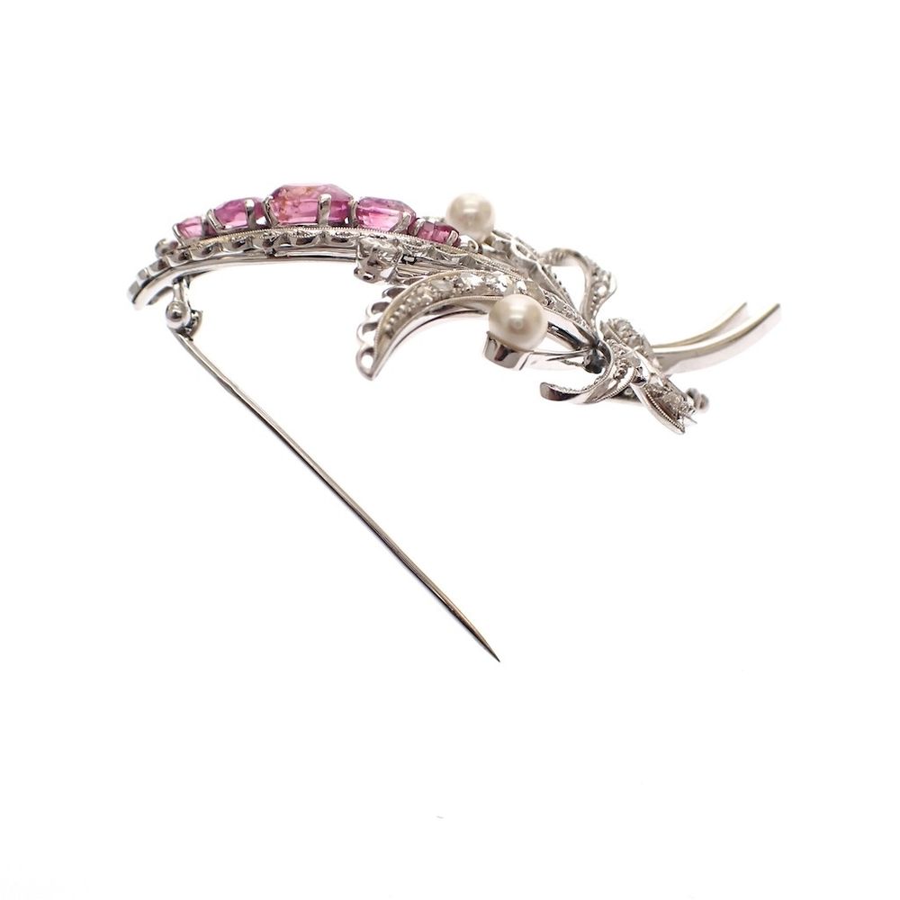 White gold floral brooch set with spinel, pearl and diamond 0.57 ct.