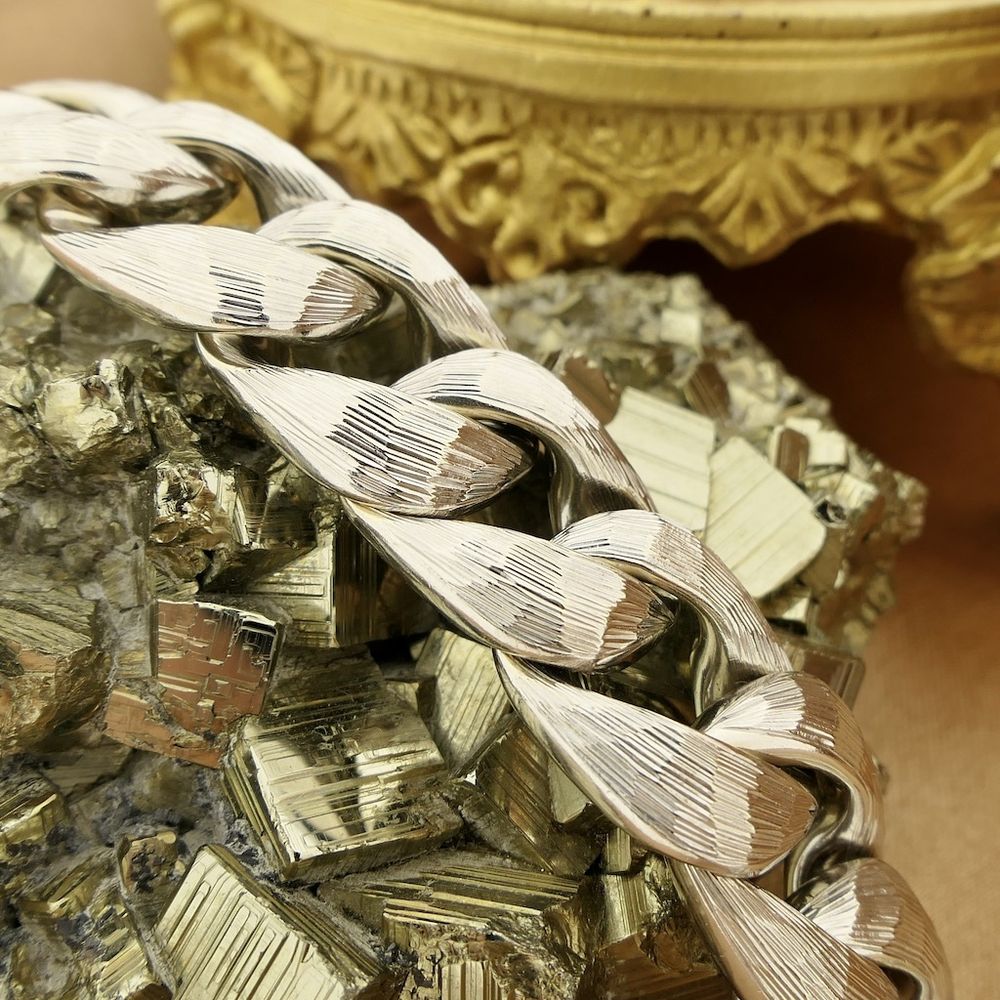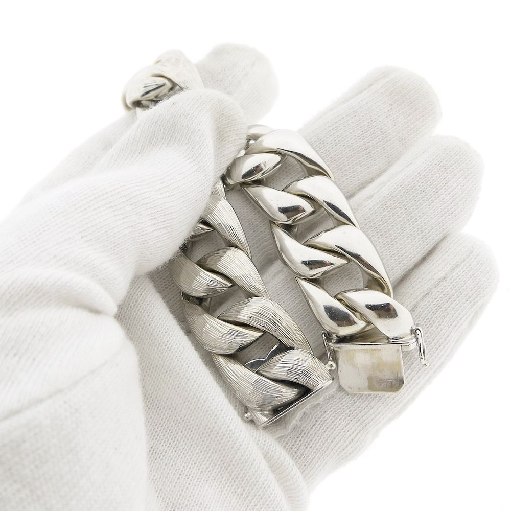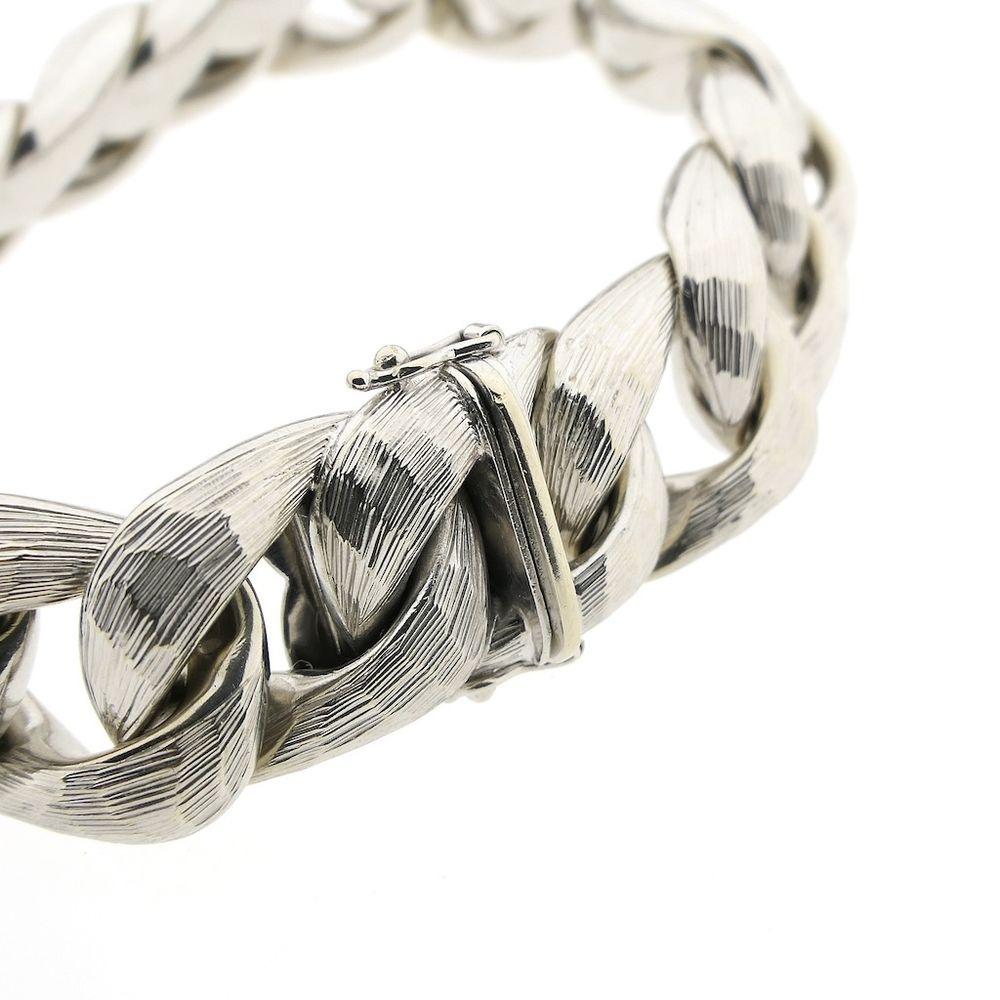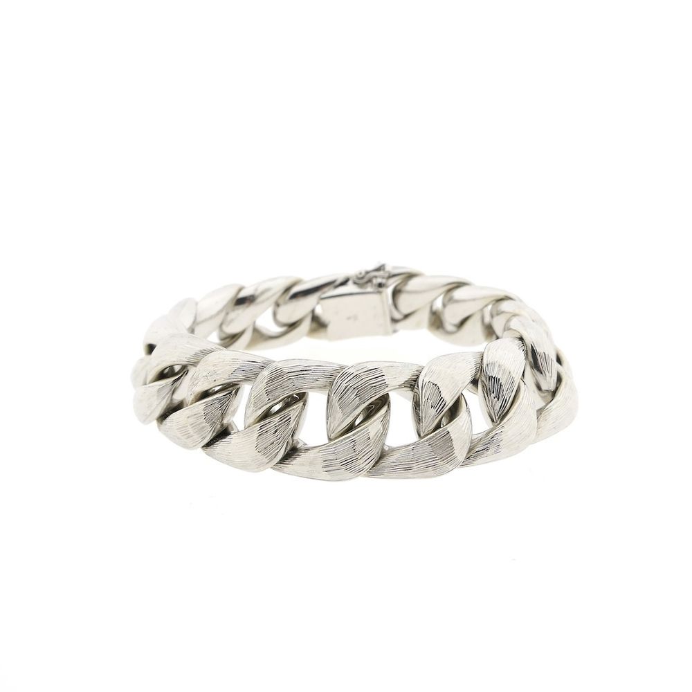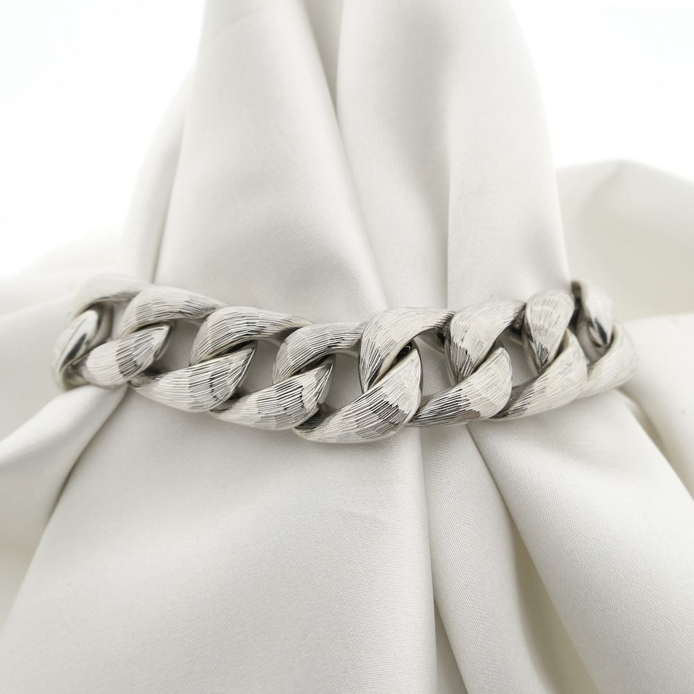 A wide white gold bracelet made with gourmet links. The links have a roughened finish with subtle relief, giving the piece a striking appearance, and the underside is smooth. A beautiful piece of jewelry suitable for both men and women. The bracelet is crafted from 14-karat white gold (585/1000).