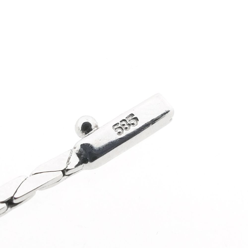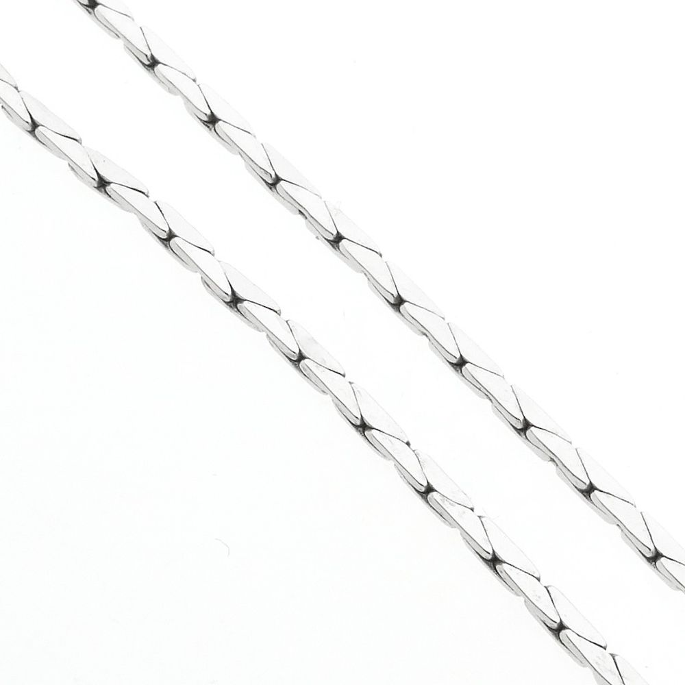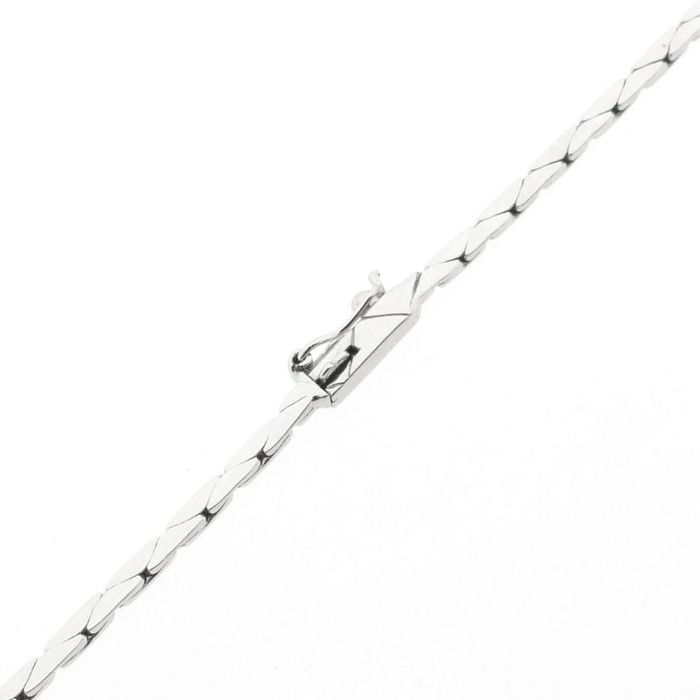 White gold necklace with cobra links and a fixed pendant. The pendant is set with seven diamonds weighing a total of 0.35 ct, and is attached to a beautiful, light Tahitian pearl. The cobra links are triangular and tightly soldered together. An elegantly designed piece of jewelry for the neck. The necklace closes with a box clasp with a safety hook and is crafted from 14-karat white gold (585/1000).