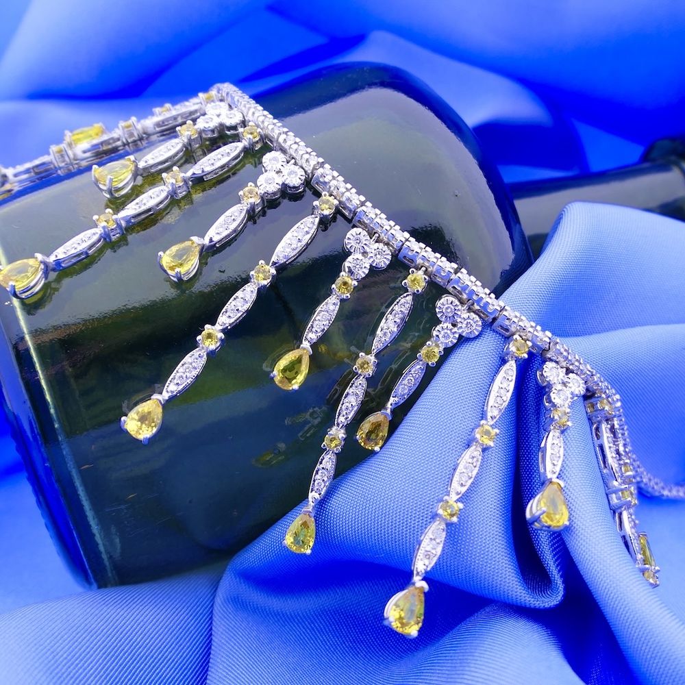 White gold necklace set with yellow synthetic sapphires and approximately 2.00 ct. of diamonds. This beautiful and unique necklace drapes beautifully around the neck. The diamonds and sapphires sparkle beautifully against the white gold. The necklace is crafted from 14-karat white gold (585/1000).