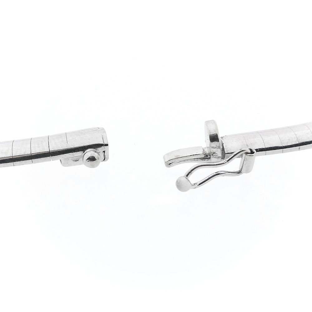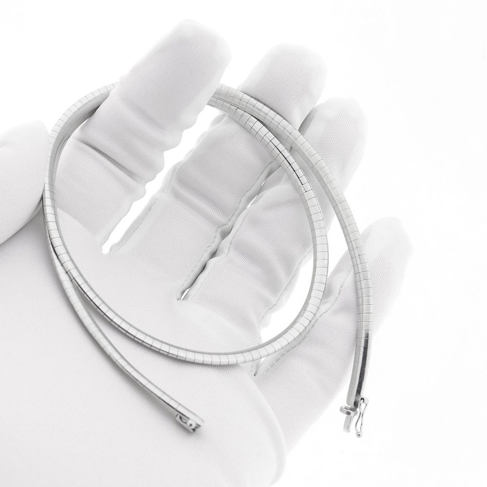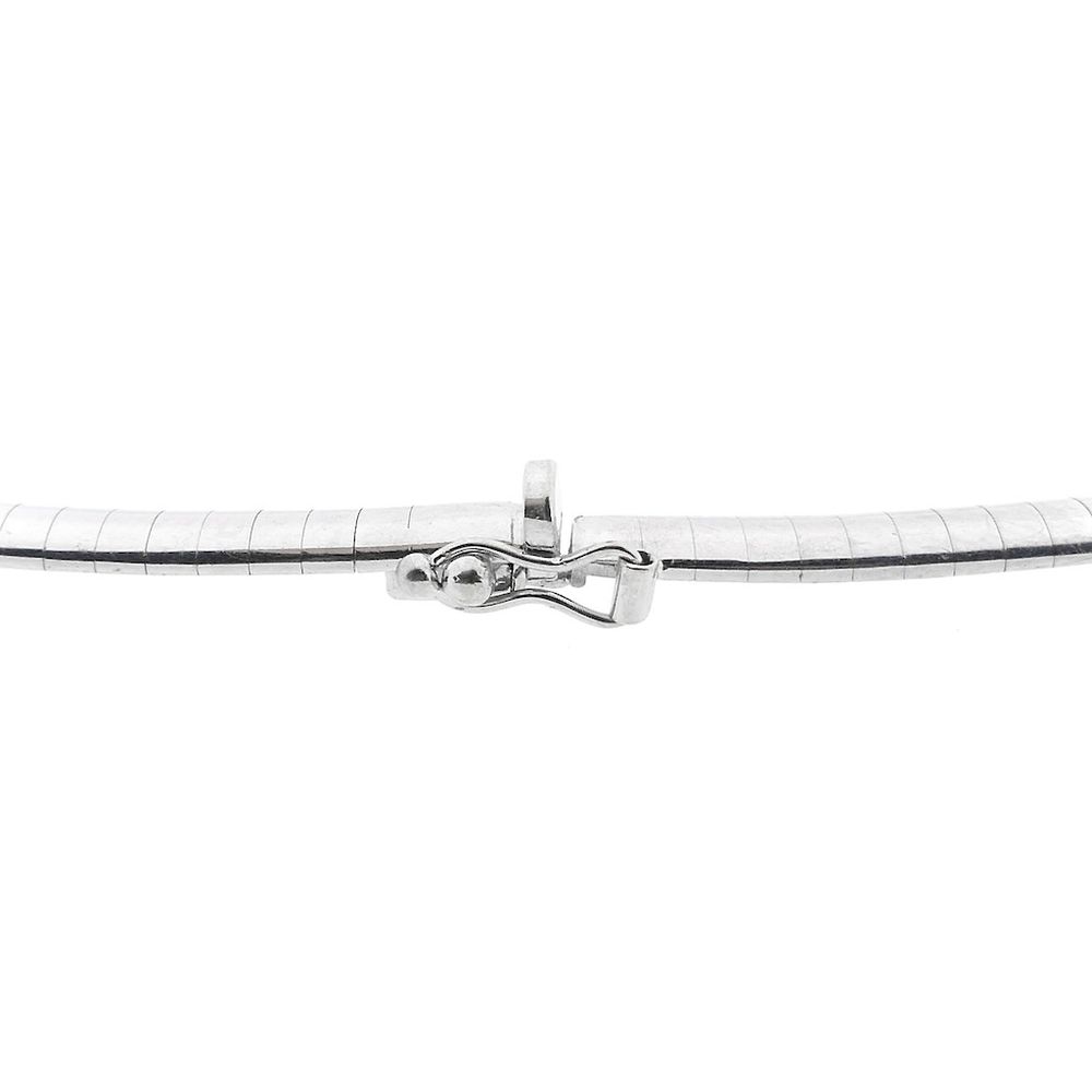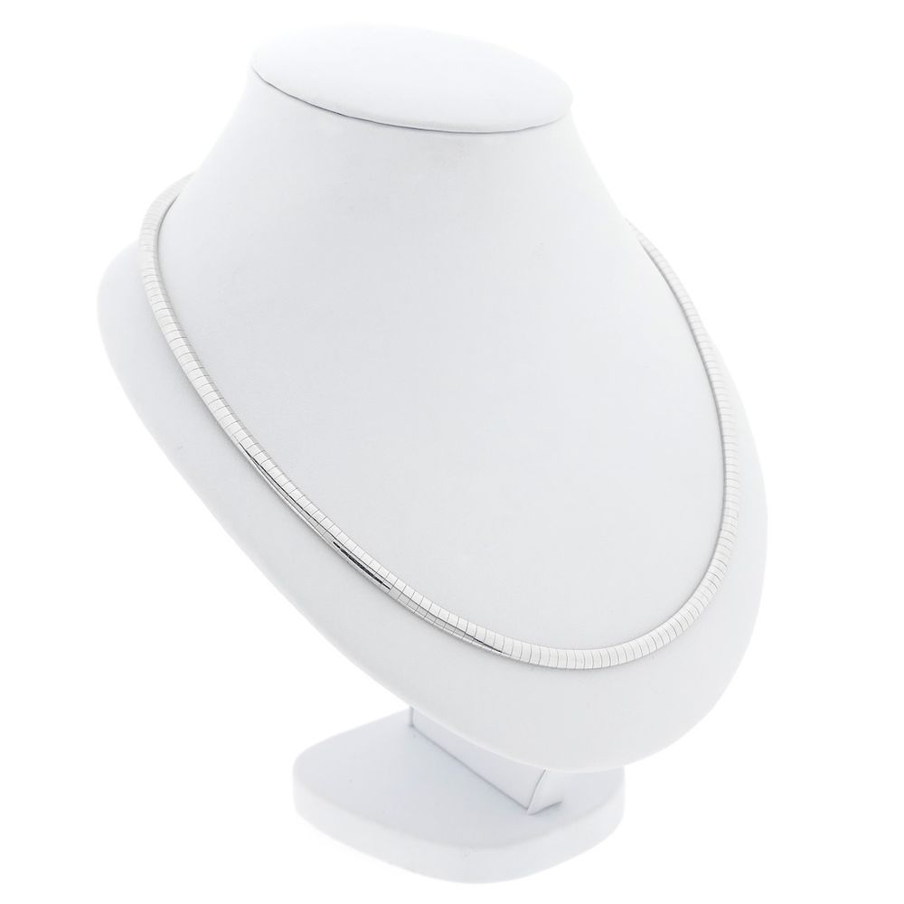 White gold necklace made with omega links. The omega links are tightly connected. The whole has an elegant and subtle appearance. This beautiful women's necklace closes with a box clasp with a safety hook and is crafted from 14-karat white gold (585/1000).