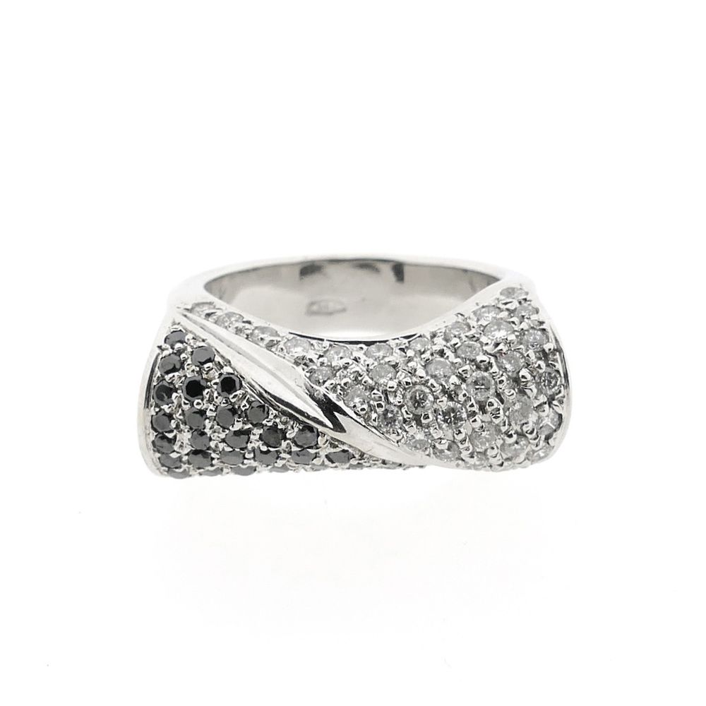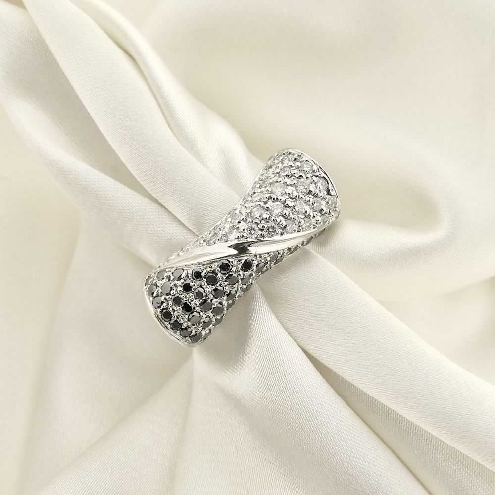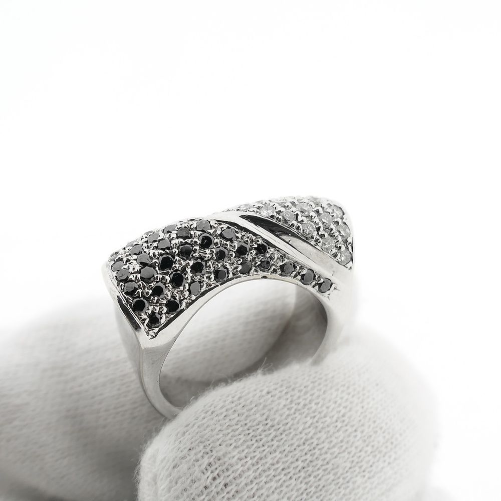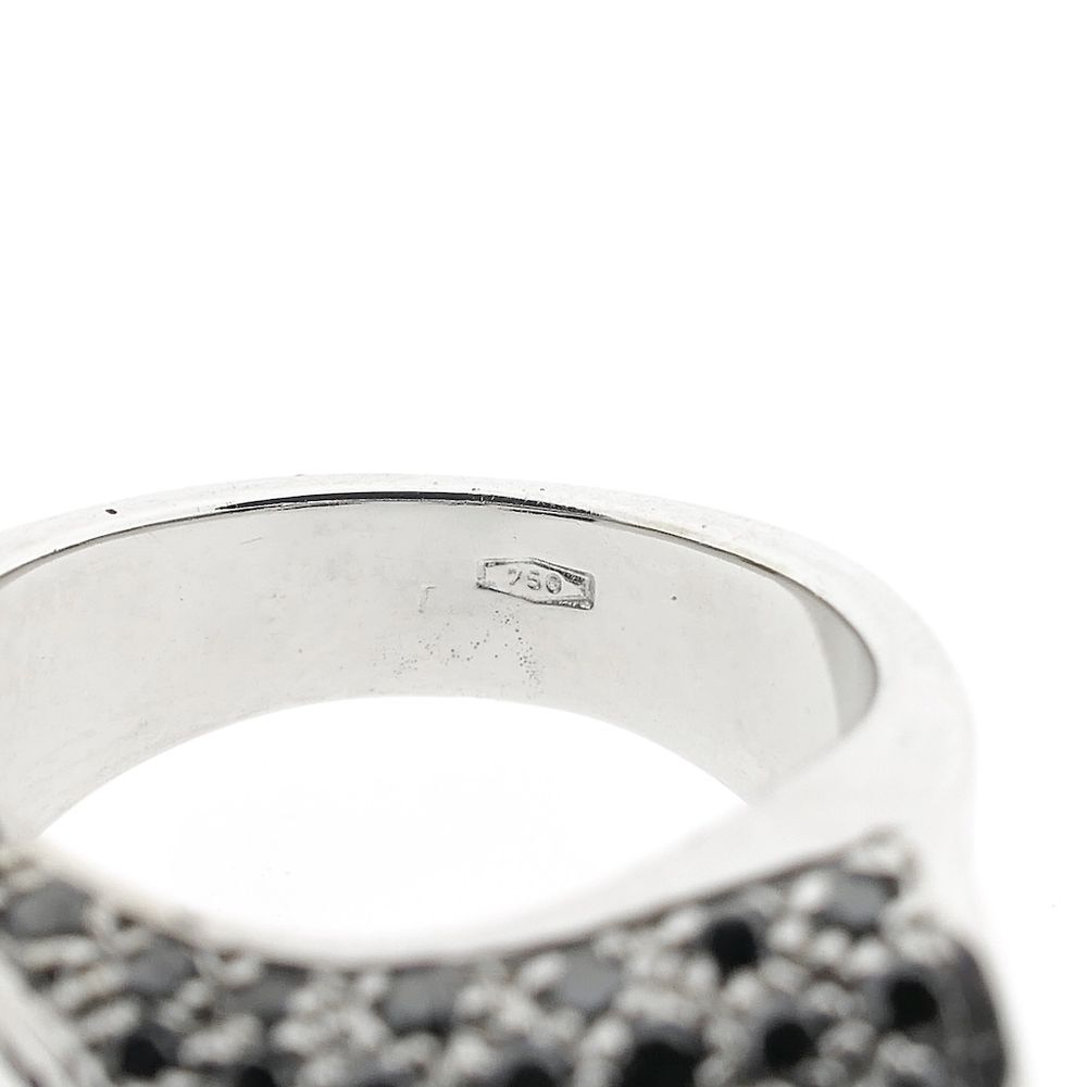 A highly exclusive white gold ring, pavé-set with black moissanite and round brilliant-cut diamonds. The stones have a total weight of approximately 1.08 ct. The ring exudes luxury. A true showpiece! Crafted from 18-karat white gold (750/1000), it is a true gemstone.