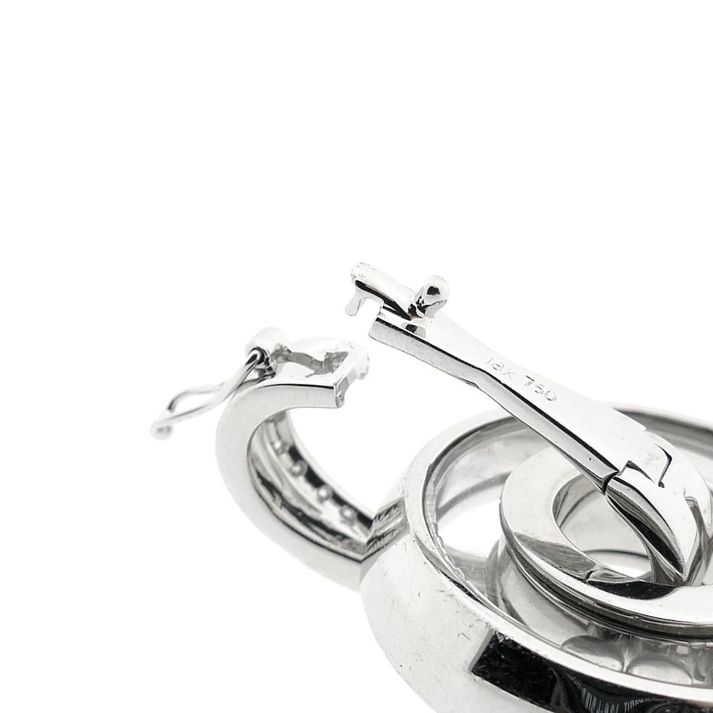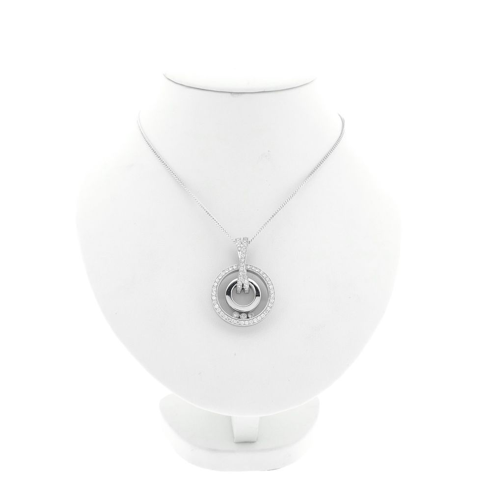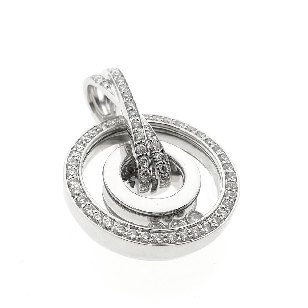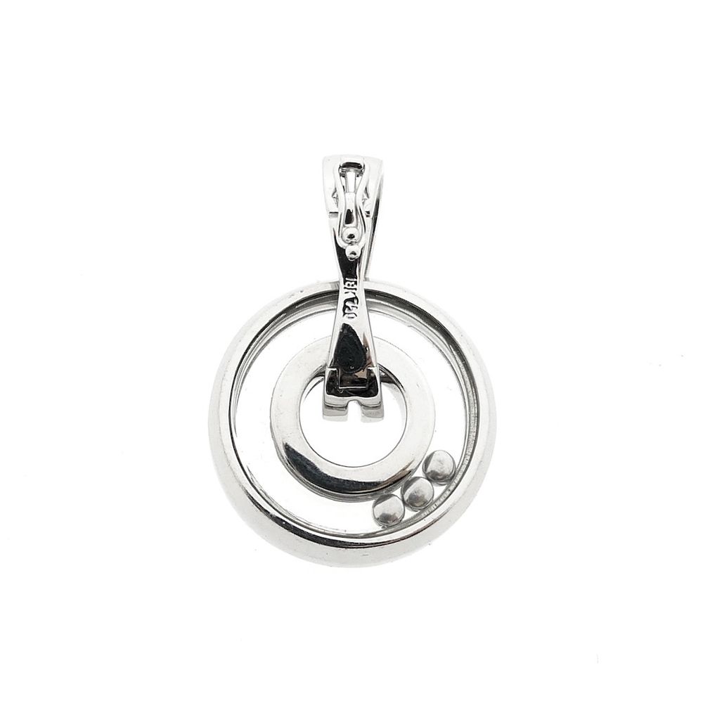 White gold pendant set with a total of 0.735 ct. of natural diamonds. The pendant features a modern design with three diamonds that can move behind a glass panel, a design familiar from the Chopard brand. This pendant has a similar design. The clasp can be opened and secures with an additional safety eye. The piece is crafted from 18-karat white gold (750/1000).