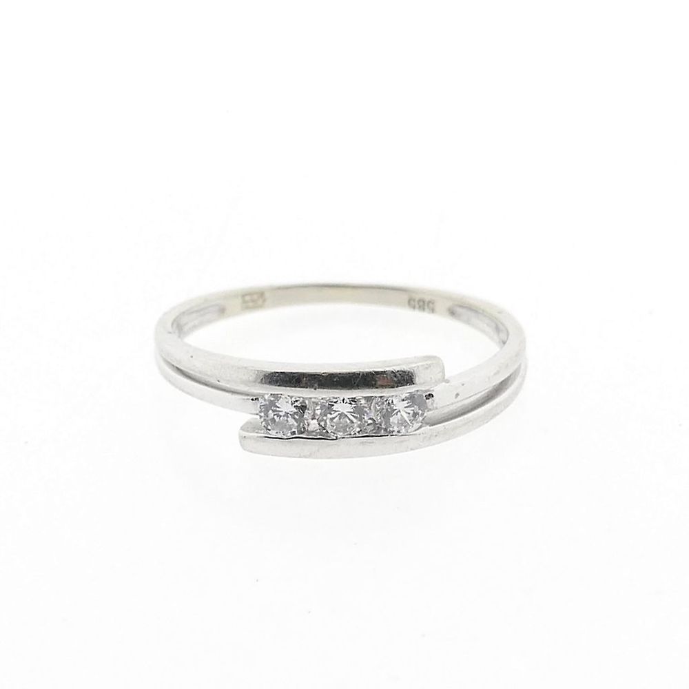 A beautiful white gold ring set with three sparkling diamonds. Crafted from 14-karat white gold (585/1000), the ring has a luxurious and elegant look.