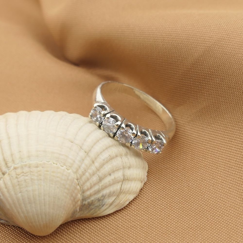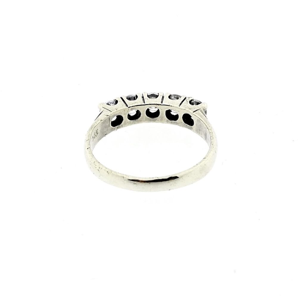 White gold ring set with five round brilliant-cut zirconia stones. The ring is suitable for wearing solo or layered with other rings. An elegant and luxurious ring crafted from 14-karat white gold (585/1000).