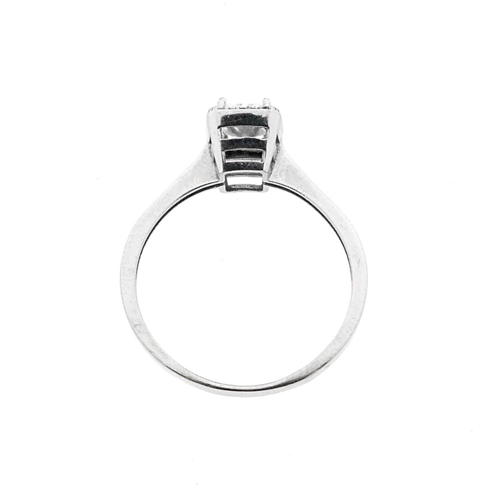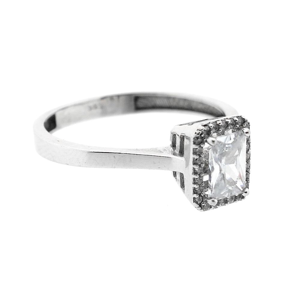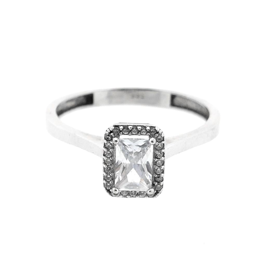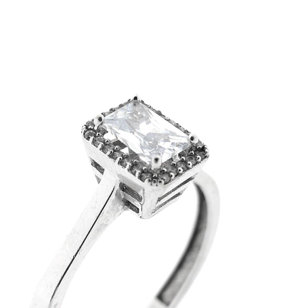 White gold ring set with zirconia. The stones are round brilliant-cut, with the largest stone cut with a scissor cut. The ring is crafted from 14-karat white gold (585/1000).