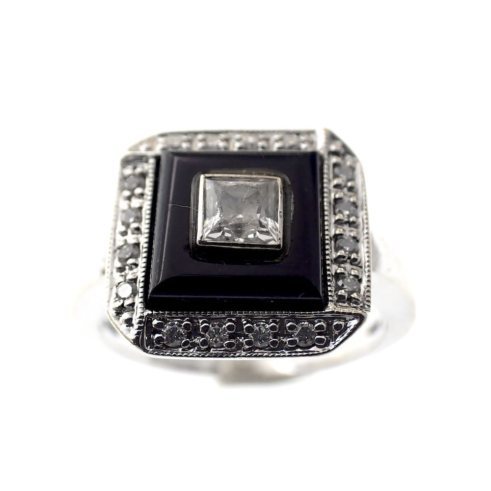 White gold ring with zirconia, onyx and diamonds; 0.16 ct.