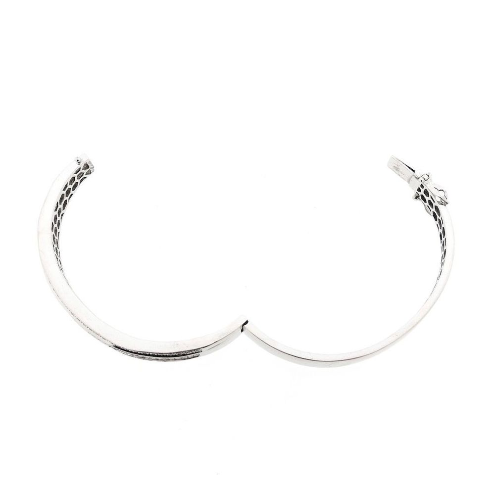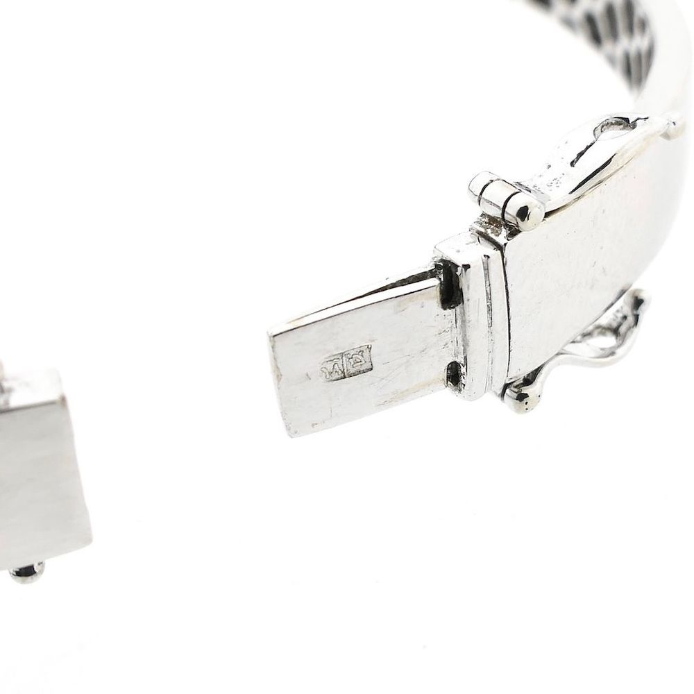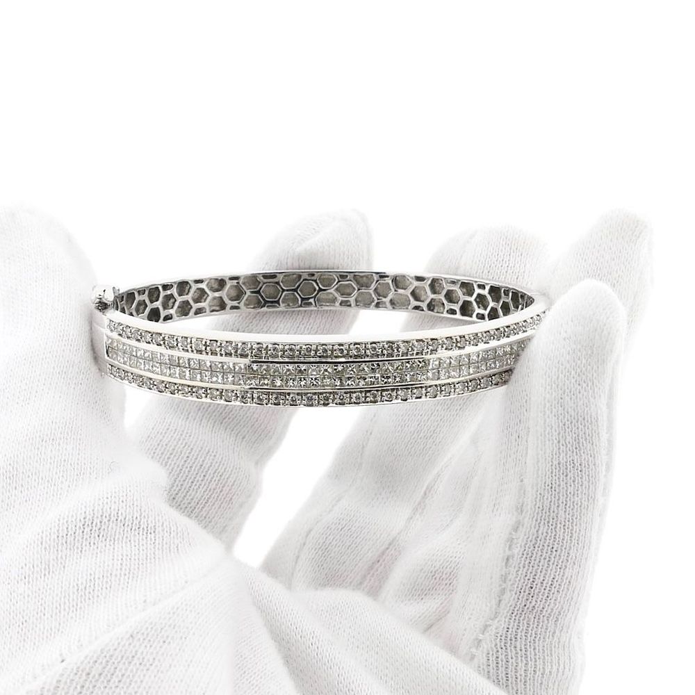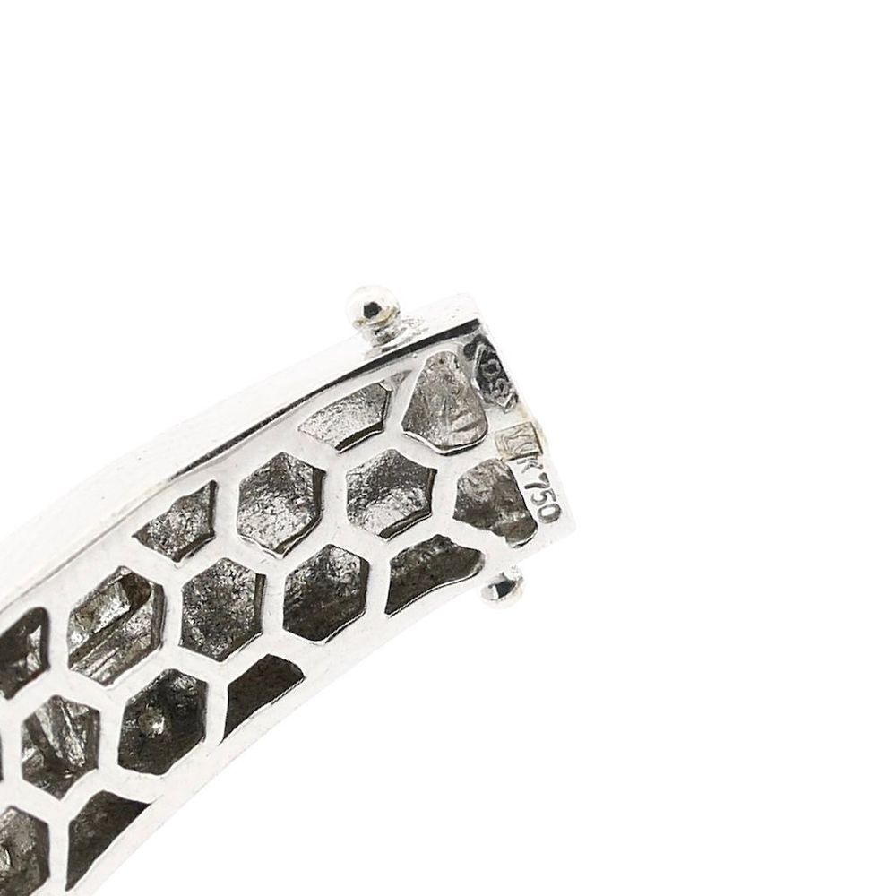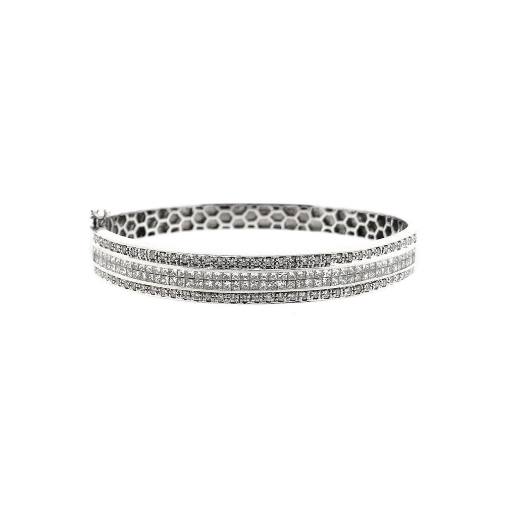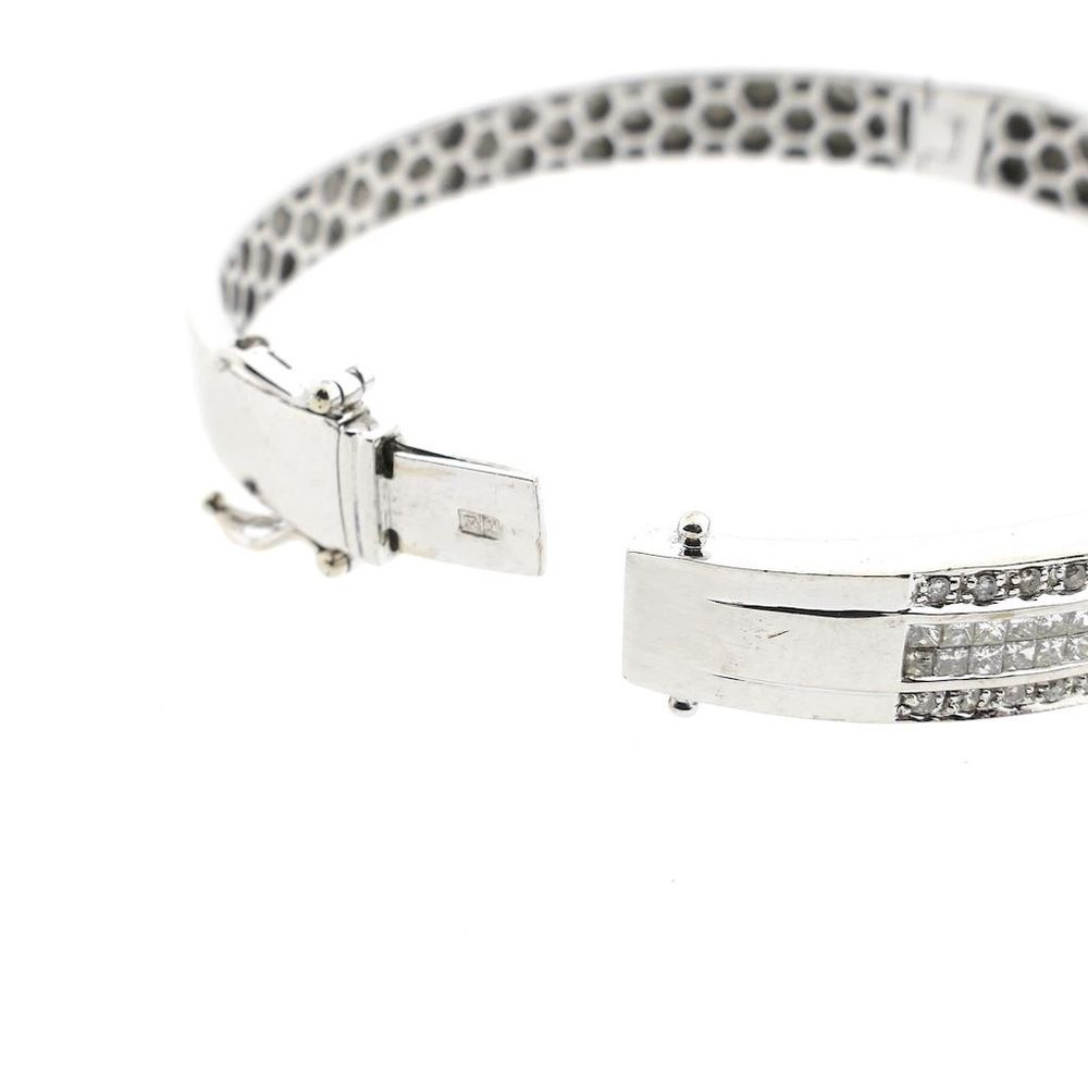 White gold slave bracelet set with a cluster of stunning diamonds. The stones on the outside are brilliant cut, while the double row in the middle is princess cut. It is a luxury bracelet made with attention to detail. A beautiful bracelet crafted from 18 carat white gold (750/1000).