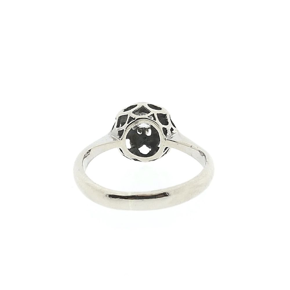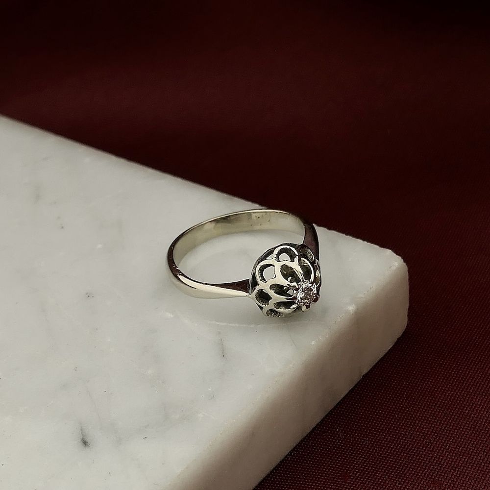 White gold solitaire ring set with a round brilliant-cut diamond. The ring has a striking, floral look, with the diamond incorporated as a real eye-catcher. This beautiful ring is crafted from 14-karat white gold (585/1000).