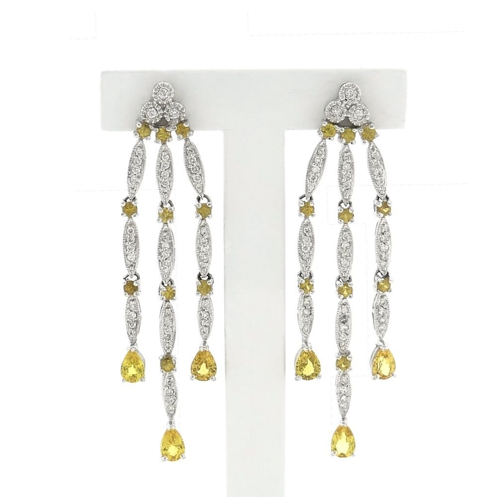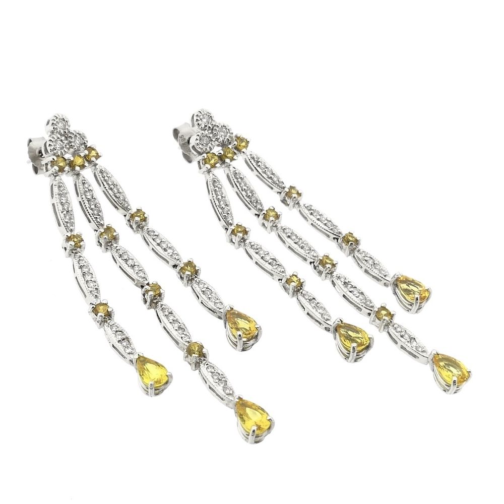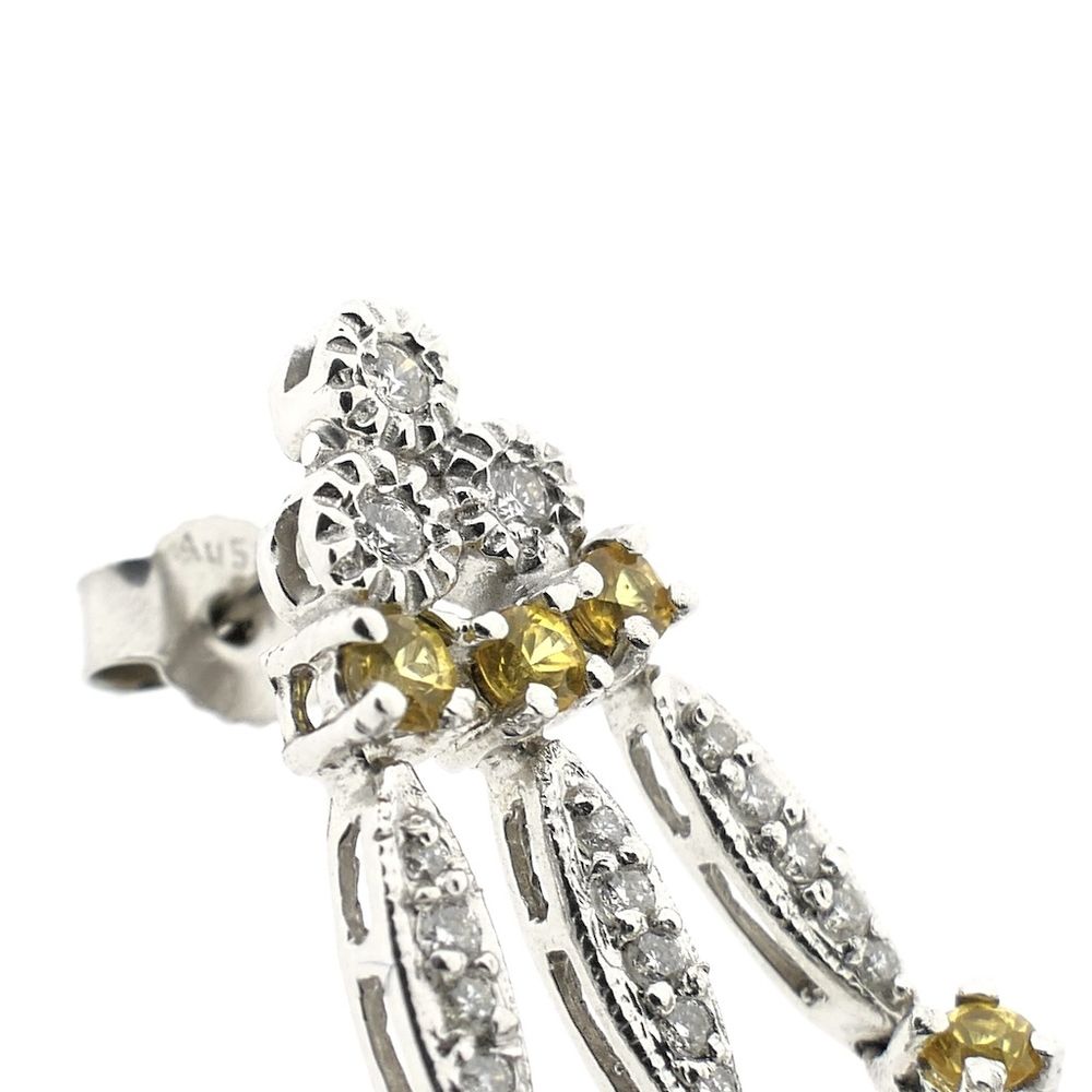 White gold stud earrings set with yellow synthetic sapphires and a total of approximately 0.56 ct. of diamonds. These unique stud earrings are a true statement piece. Crafted from 14-karat white gold (585/1000), they are a true statement piece.