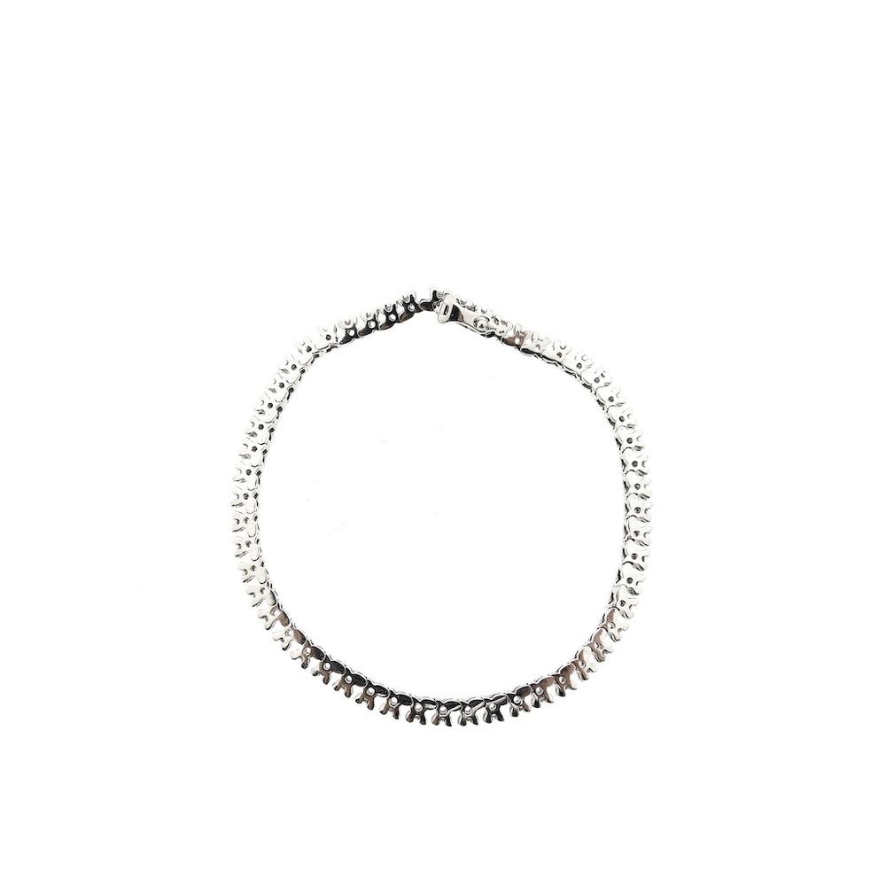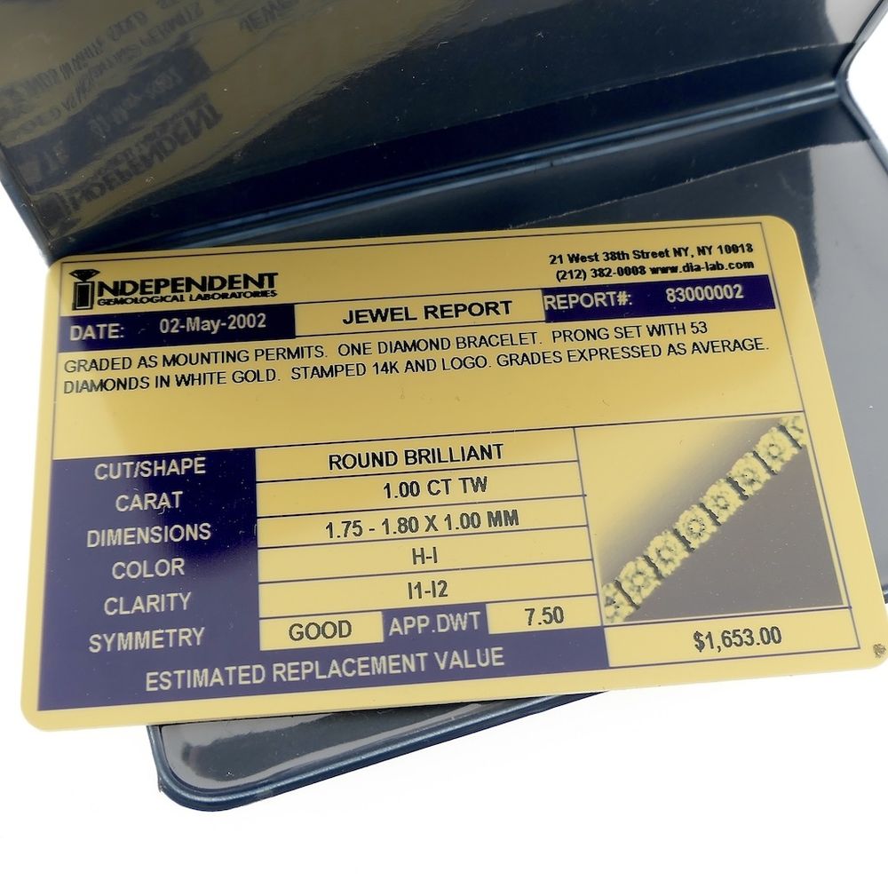 A beautiful white gold tennis bracelet set with several sparkling diamonds. The stones have a total weight of 1.00 ct. The bracelet has an elegant and luxurious appearance. It closes with a box clasp and is crafted from 14-karat yellow gold (585/1000). This bracelet comes with an official certificate from Independent Gemological Laboratories. The tennis bracelet takes its name from a famous tennis player who lost her bracelet during a match at the 1987 US Open. The match was interrupted to retrieve her precious bracelet! It was a diamond-studded bracelet, and since then, it has been called a tennis bracelet.