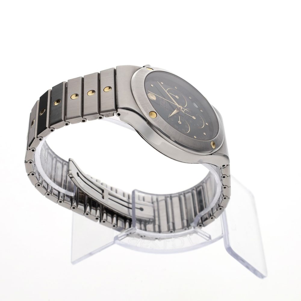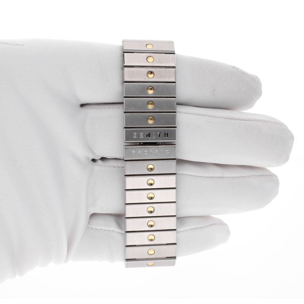 What a rarity! The Zenith Pacific El Primero Chronograph with reference number 59.0010.400. A striking vintage/90s timepiece that combines the precision of the El Primero caliber with 90s design. The Zenith Pacific ‘El Primero’ 59.0010.400 is a men’s watch that not only keeps time, but carries history. Equipped with the legendary El Primero caliber 400, the first automatic high-frequency chronograph movement (36,000 bph), this watch is a symbol of technical innovation and Swiss perfection. This specific reference – 59.0010.400 – belongs to a lesser-known, yet extremely beloved (and rare) line within the El Primero family. The ‘Pacific’ version distinguishes itself with a sporty look, subtle vintage details and a robust stainless steel case of approximately 40 mm. The dial is uncluttered and stylish, with classic subdials and a tachymeter scale all around, making it both functional and elegant. What makes this model extra special is its rarity: it's a rare find, especially in good, original condition. This makes it an attractive piece for collectors who value mechanical excellence and character. Whether you're drawn to the story behind the El Primero movement, the 1990s vibe, or the reliable precision Zenith has delivered for decades, the Pacific 59.0010.400 is a watch that continues to fascinate. This high-quality chronograph watch is internally equipped with the world-famous Zenith "El Primero" Cal. 400 automatic movement. This movement, which was also used in early Rolex Daytonas, has an absolute top status in the Swiss watch industry. This beautiful movement runs smoothly and accurately. This watch comes on the original steel Zenith bracelet with gold-inlaid circles on each link. This steel bracelet beautifully balances the watch. The strap fits wrists up to approximately 19cm. The caseback is engraved, which is why we're offering this watch well below market value (approximately €3500, source: Chrono24). This watch comes with a luxury in-house box and an in-house warranty report with a 1-year warranty.